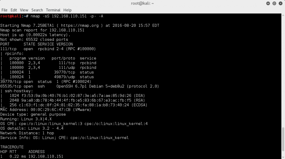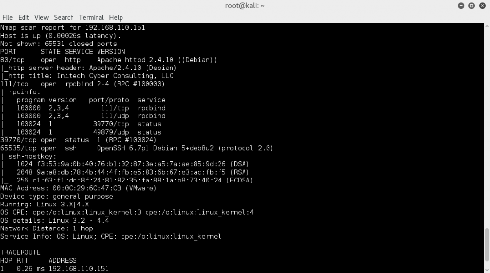 First, we start off with our good trusty friend Nmap to check our machine for open ports (a ping sweep is not necessary since the VM has a static IP of 192.168.110.151.)