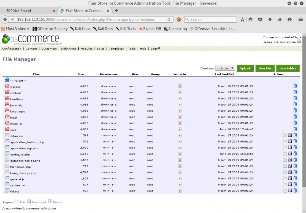 Looks like Oscommerce lets you choose what paths to use for things like Curl and ImageMagick, well that's not secure! Doing some research I tried to see how I could get this curl to execute in order to change this path and have it run a custom script, and as it turns out php-curl needs to be installed, which it wasn't, and further investigation showed all folder structures as unwriteable so I couldn't simply upload an image and have ImageMagick or any of the unzip utilities run instead. At some point I found a file manager and decided to really enumerate it, and after some time, finally found our writeable directory as denoted by the green checkmark!