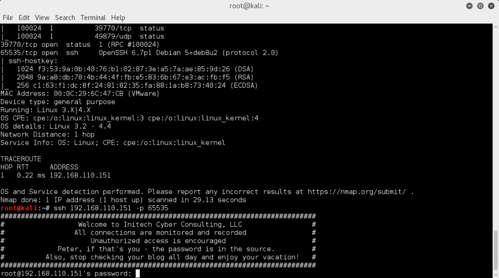 Oh boy! Looks like our machine over here is pinging a dns server every so often. If we recall the SSH banner there was something about Peter checking his blog all day. A client attack perhaps! I did some research to see how I could manipulate the traffic to see the website it was visiting and tried to brute force the peter user overnight but came up with nothing. Stumped, I spoke to a friend who had gotten a hint from b3n and told me to "Look again at the banner". It couldn't be.... BUT IT WAS. After typing in inthesource as our password we get an instant disconnect. I decided to try another portscan to see if anything changed.