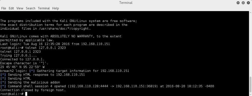 I admit, at this point I was stumped for quite a long time. I ran LinEnum and enumerated through the file system and couldn't really find much of interest at first. After a while of being stumped again I got a small push from b3n himself this time, I popped a netstat -tunlp and took a very close look. I immediately noticed something strange. TCP port 2323 was open on localhost only. I did a portforward from the victim machine to my machine with ssh -R 2323:127.0.0.1:2323 root@192.168.110.128 and telnetted into the port to find it was a login form with some coordinates!