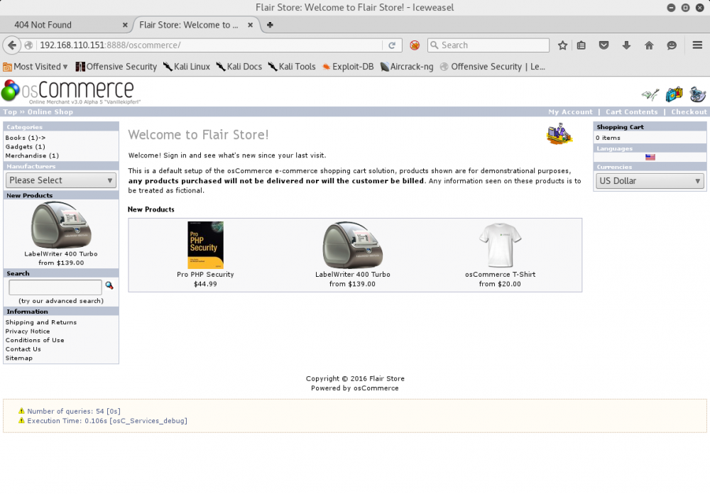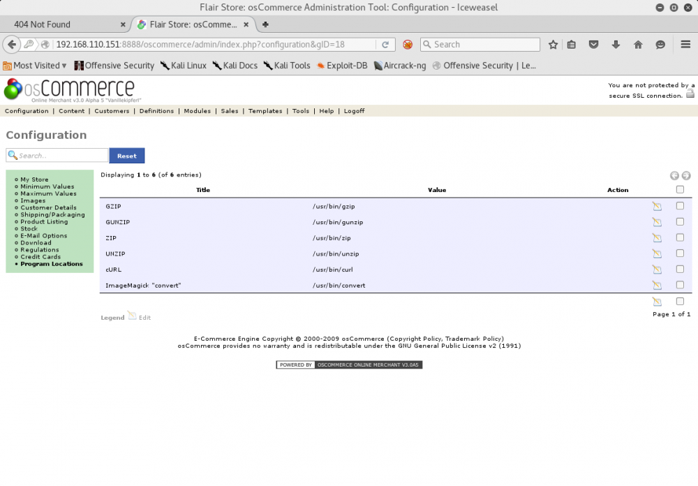 I did some digging through the filesystem on the folder to see if I could find a mysql password and try to login to the website. After some time I found the root user has no password! I logged in to mysql as root and got the store hashed for oscommerce admin. Decrypting the hash gave us 32admin, and it didn't work. Strange, because you'd think the website would rely on this hash. After some research I found oscommerce adds 2 extra integers for obscurity to secure the hash, and after figuring this out I was able to login to oscommerce as the admin user with password admin. I did some digging through the admin interface and immediately found something interesting.