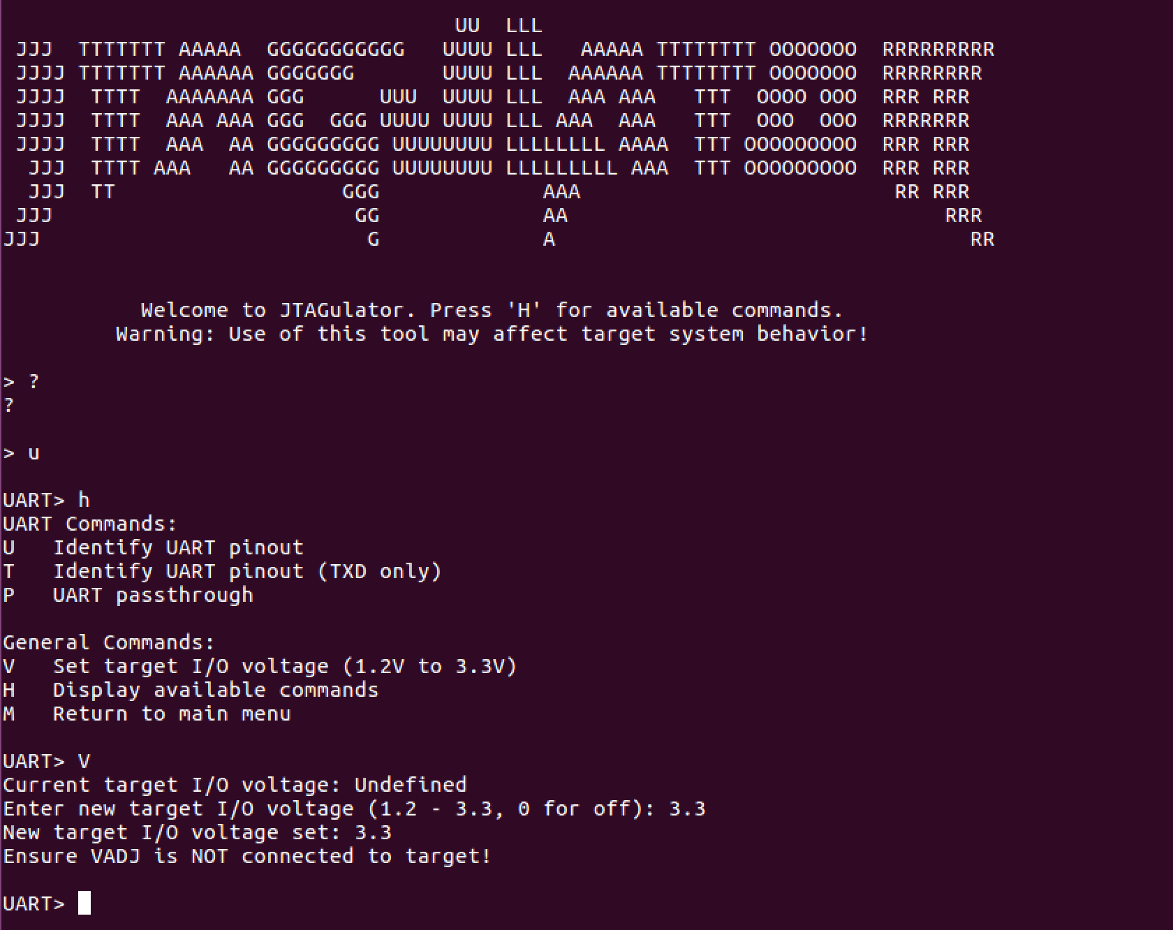 Upon connecting with picocom we are presented with a terminal for the Jtagulator. Going through the menu options we can identify the UART brute forcing tool and switch to it with the switch "u". Once in UART mode we must set a target voltage with "V" for the SoC. We can identify the UART voltage by identifying an SoC on the board and finding the relevant datasheet. For our Belkin N300, we identify an RTL8196C SoC chip and the relevent datasheet is found here: https://www.datasheetq.com/datasheet-download/706925/1/Realtek/RTL8196C. The proper voltage for our chip is 3.3.