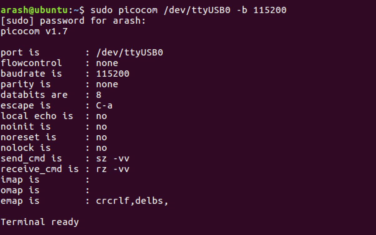 Now we need to access our Jtagulator using a serial console access tool. I'm a fan of using picocom. The Jtagulator communicates over a baud rate of 115200 so we will connect to its serial interface with a baud rate of 115200 using picocom and should get presented with a shell.