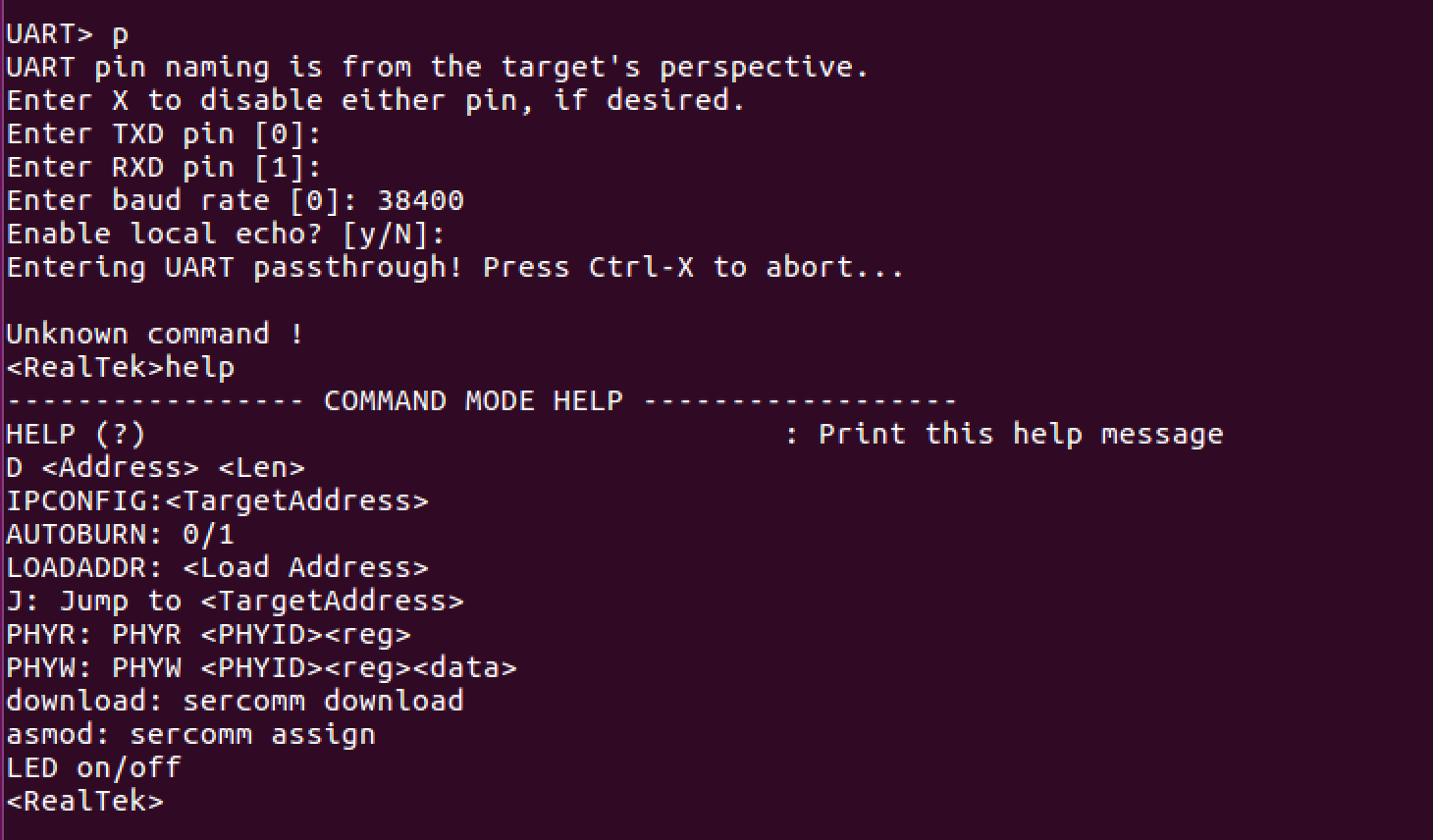 To confirm these parameters are valid we simply switch to UART passthrough with the "p" parameter, set TXD to 0, RXD to 1, and baud to 38400. I then type "help" and hit enter to verify we have a proper shell with input and output.