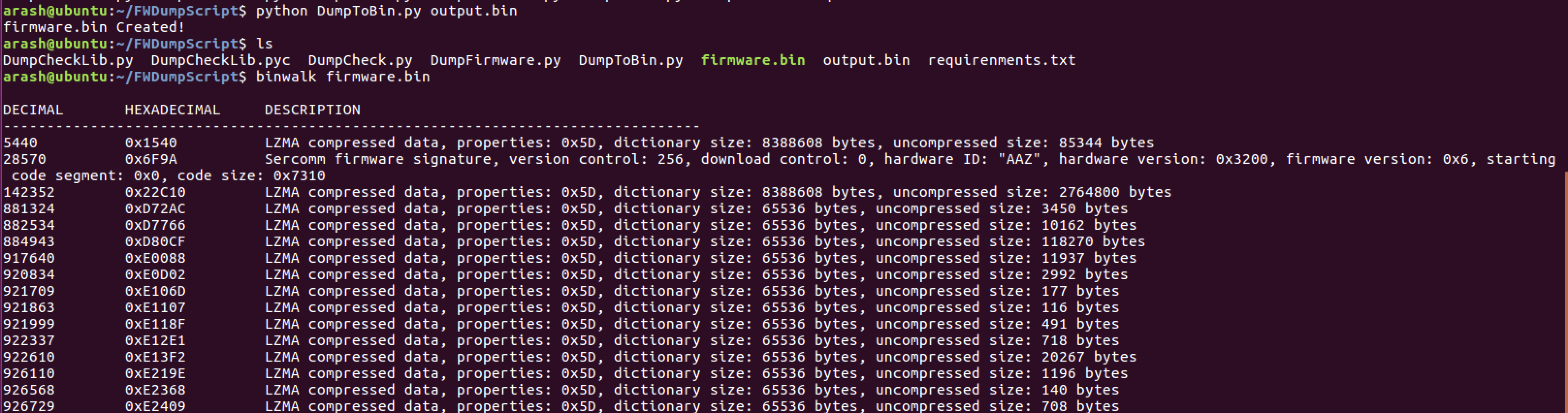 After about 2 hours the script completes and provides an output.bin file with all the bytes as plaintext. Using my DumpToBin.py script we can convert the text file to a valid firmware bin.