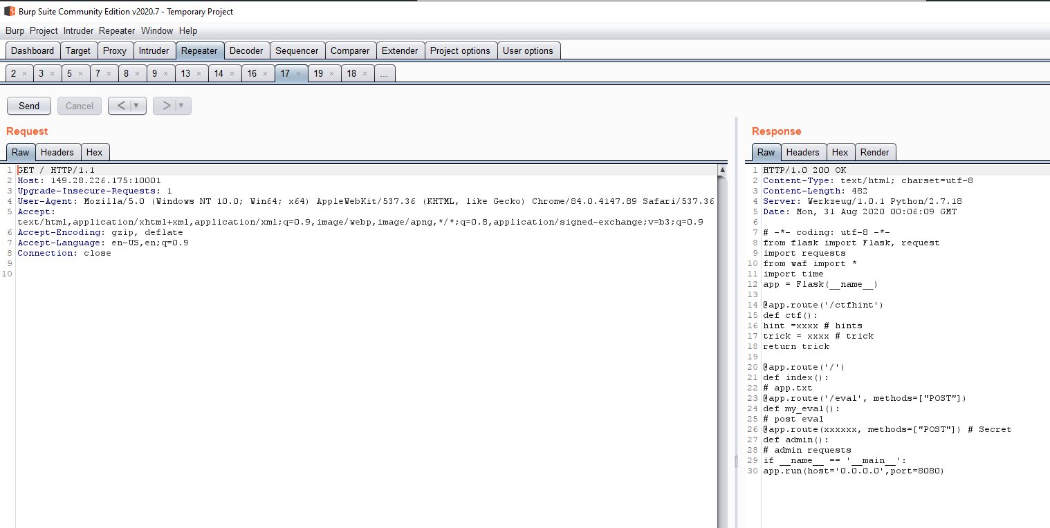 We are immediately presented with a redacted python flask script. We see a few immediately interesting things. Ctfhint function, admin function, and eval function all stood out.