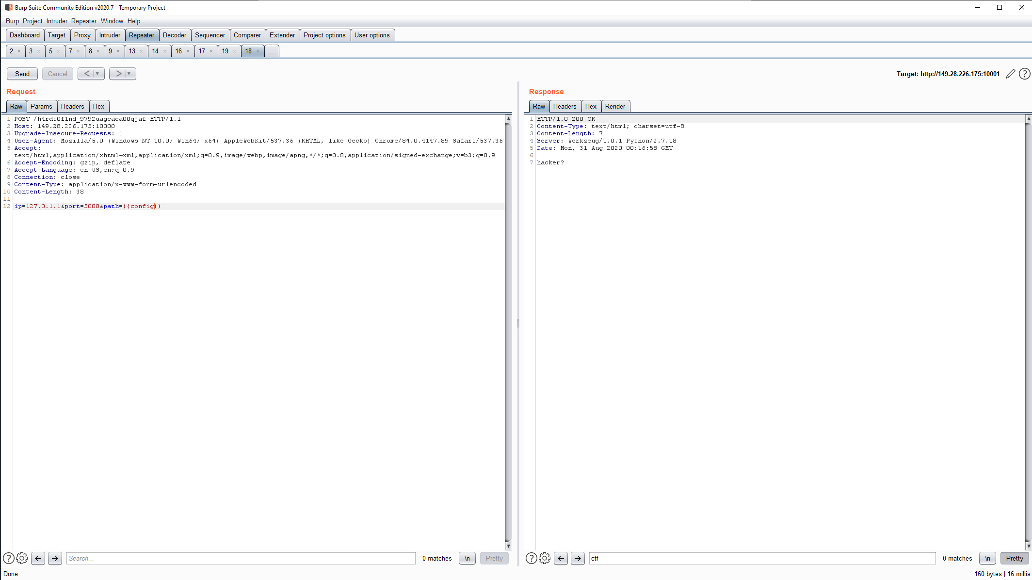 And we successfully access the resource. It's another SSTI! Unfortunately, since we can't dump the waf_path filter, we have to go blind, but at least we know the flag is in the config!