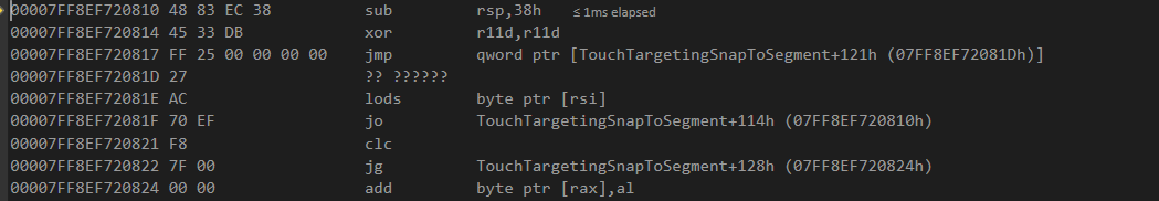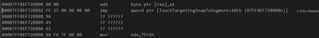 If you look at this image you can see we are executing those first 2 instructions we overwrote! Right after the copied bytes we do a second JMP QWORD PTR right to the location of the OriginalFunction+7 (since the size of the trampoline is 7 bytes in this instance). This will put us right at the start of the third instruction. Let's see:
