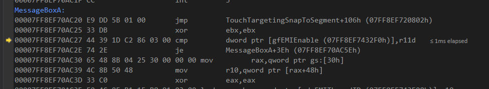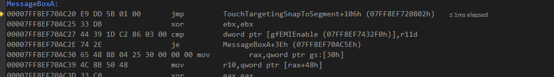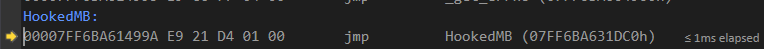So MessageBoxA is a somewhat perfect example of the issue previously mentioned. As you can see in the BEFORE screenshot the first instruction is only 4 bytes, this means we'll need to store the first 2 instructions, then our relative jump continues to overwrite the first 5. We do not need to alter the remaining bytes, we will have our trampoline execute the first 2 we stored and then jump back to location 0x00007FF8EF70AC27. Let's continue in the debugger to see what the new hooked functionality looks like. We will start right after running the JMP: