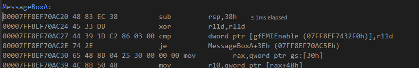 Let's now take a look at this while debugging. We will hook MessageBoxA. First, let's see what MessageBoxA looks like clean vs hooked.