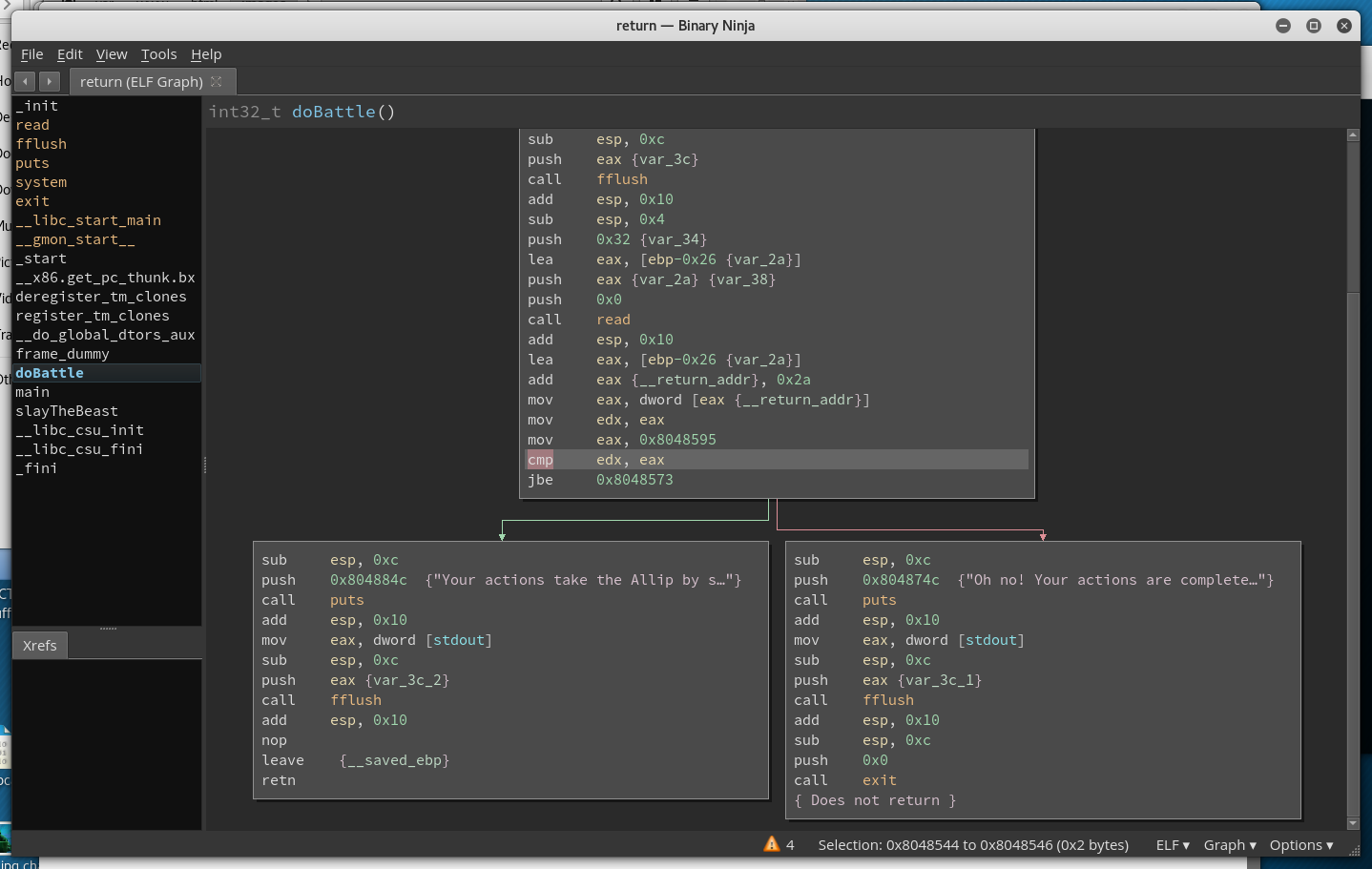 It looks like when our jmp isnt taken at that "jbe 0x08048573" point we get thrown a message that says our actions are ineffective and then the program exits out. My next step was to run this through a debugger and see what was happening in that comparison before the jbe.